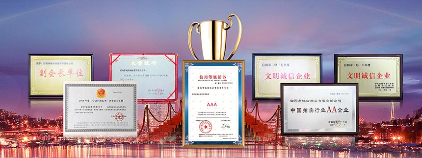 诚信拍卖公司先后被授予“中国拍卖行业AA级企业”、“河南省拍卖行业优秀企业”、“守合同重信用企业”、“信阳市文明诚信企业”等多项殊荣。公司自有办公场地2800平方米,是目前信阳市拍卖行业实体规模大、美誉度高的企业。>>查看更多>>